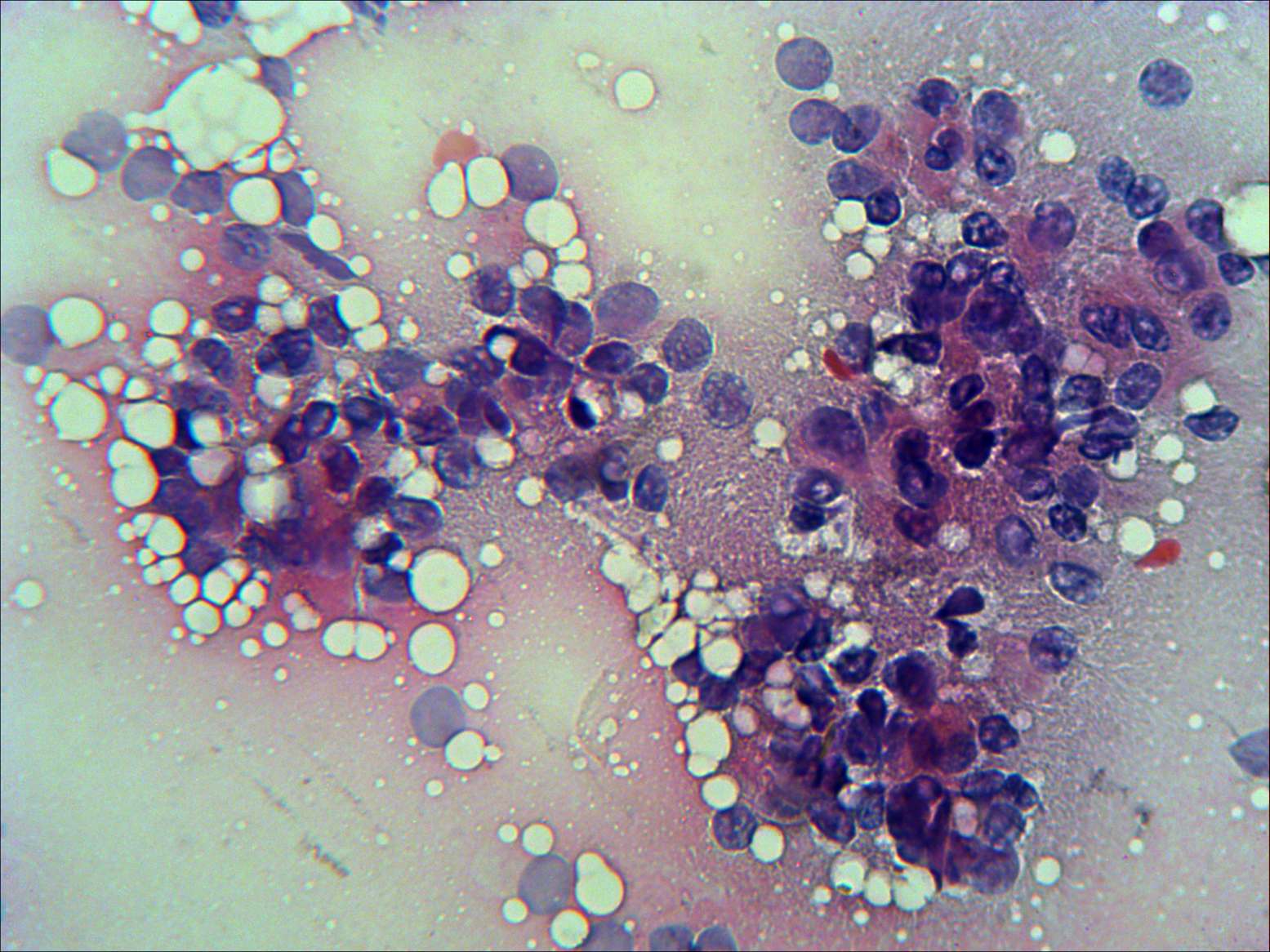 Pap-smear, 400x. Irregular clusters of thyrocytes with nuclear crowding and overlapping.