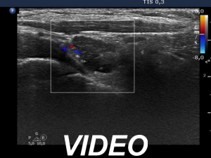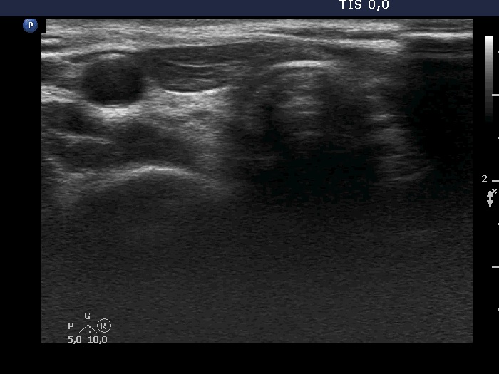 Clinical data: A 25-year-old woman was referred for evaluation of a suspicious nodule which was detected on routine ultrasound examination. The patient has undergone on total thyroidectomy and radioiodine therapy for a papillary cancer for 6 years. The tumor was a T2 cancer. Thyroglobulin levels were in the range of 0.2 to 0.8 ng/dL throughout the postoperative period without any tendency.