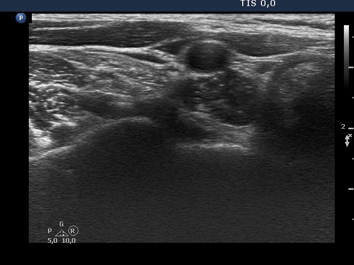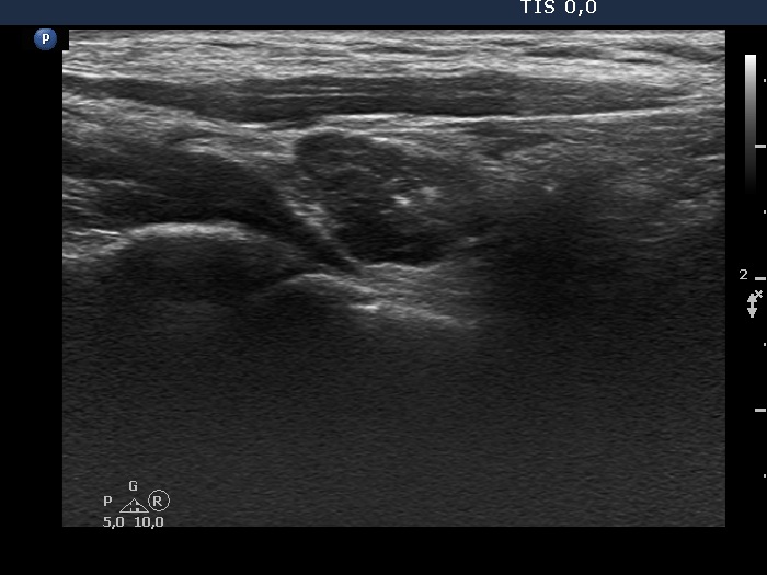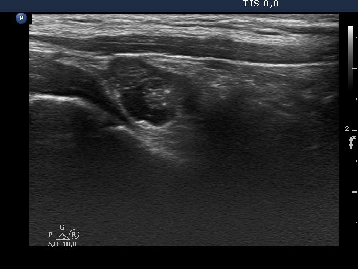 Ultrasound. Connective tissue replaced the thyroid parenchyma in both thyroid beds. There was a hypoechoic mass in the lower part of the right thyroid bed dorsal to the carotid artery. The lesion was a mixed, dominantly solid nodule and had microcalcifications.