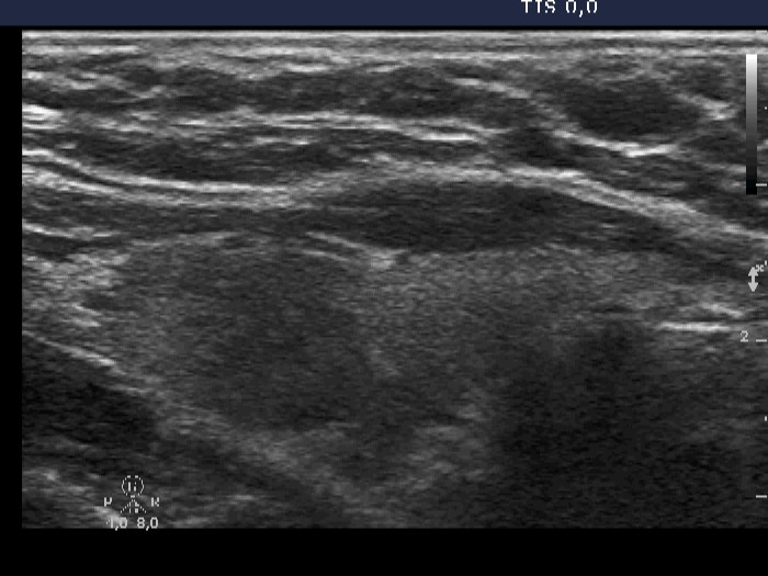 Right lobe, longitudinal scan. Minimally hypoechogenic areas are demonstrated.