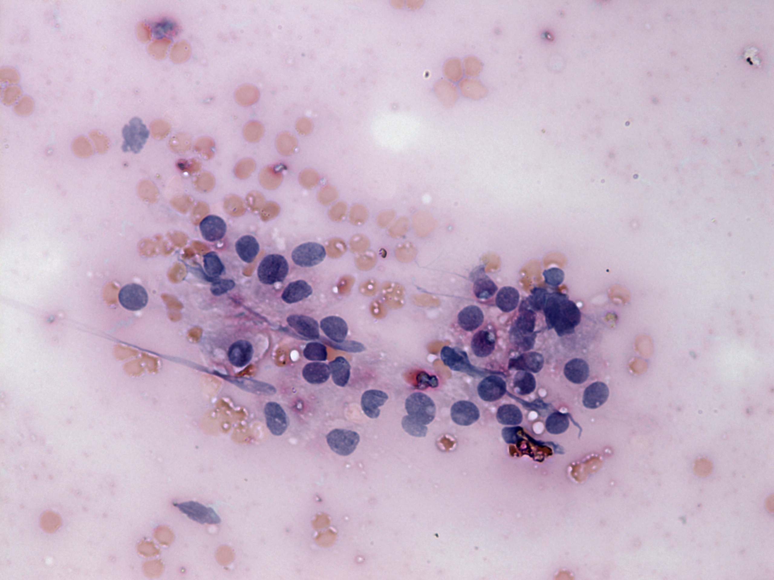 Pap-smear, 400x. A cell group composed of follicular cells and lymphocytes. Note nuclear debris.