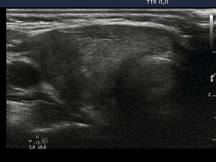 Ultrasonography: the thyroids was echonormal and contained small hypoechogenic areas. The vascularization was average.