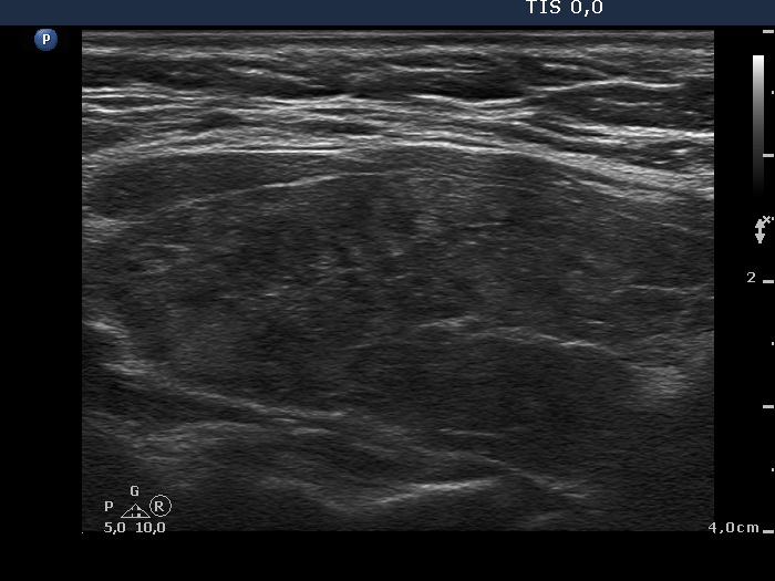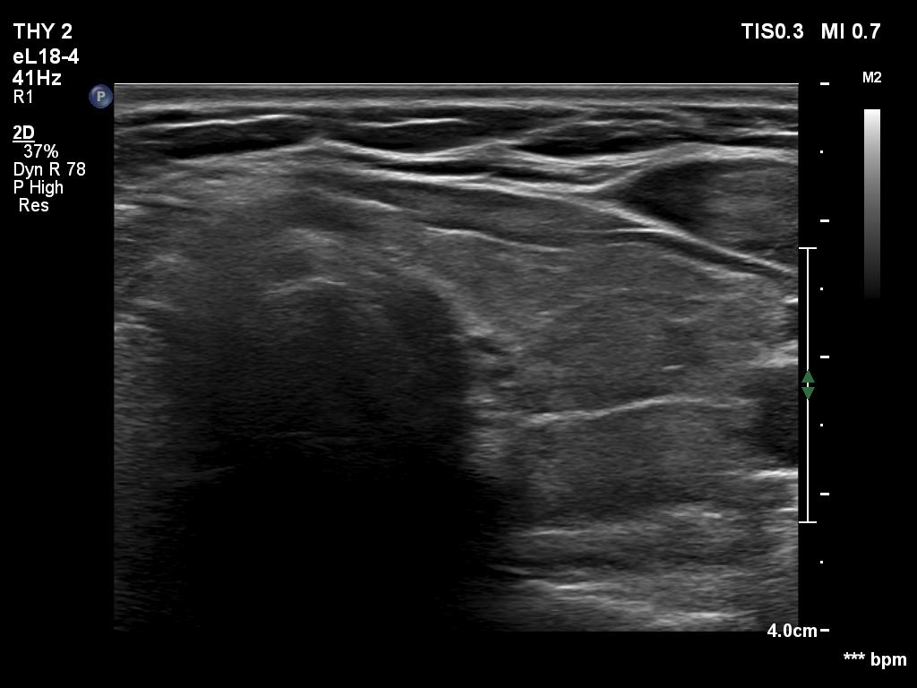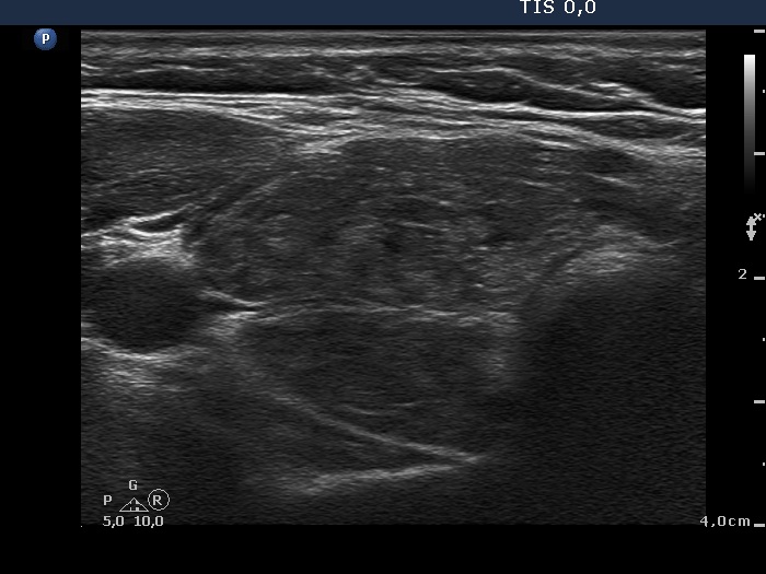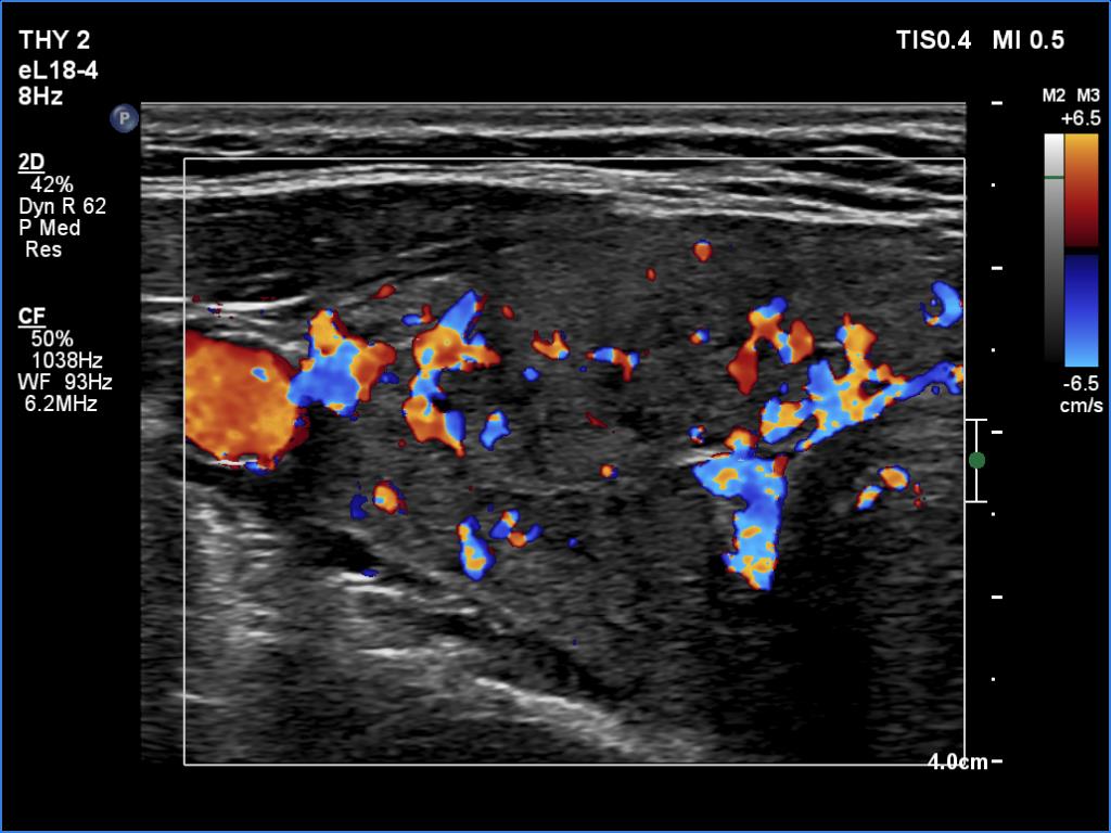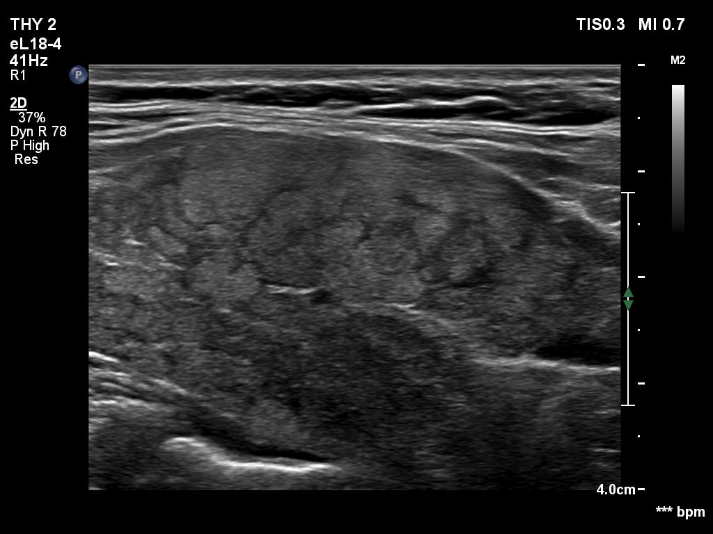Ultrasonography. The thyroid was composed of hypoechoic and isoechoic islets divided by hypoechoic bands. The presentation corresponded to micronodular pattern.Suggestion: daily 75 microgram levothyroxine. The is 3 months, ultrasound in three years.