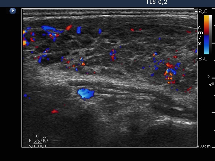 Right lobe, longitudinal view, color Doppler mode.