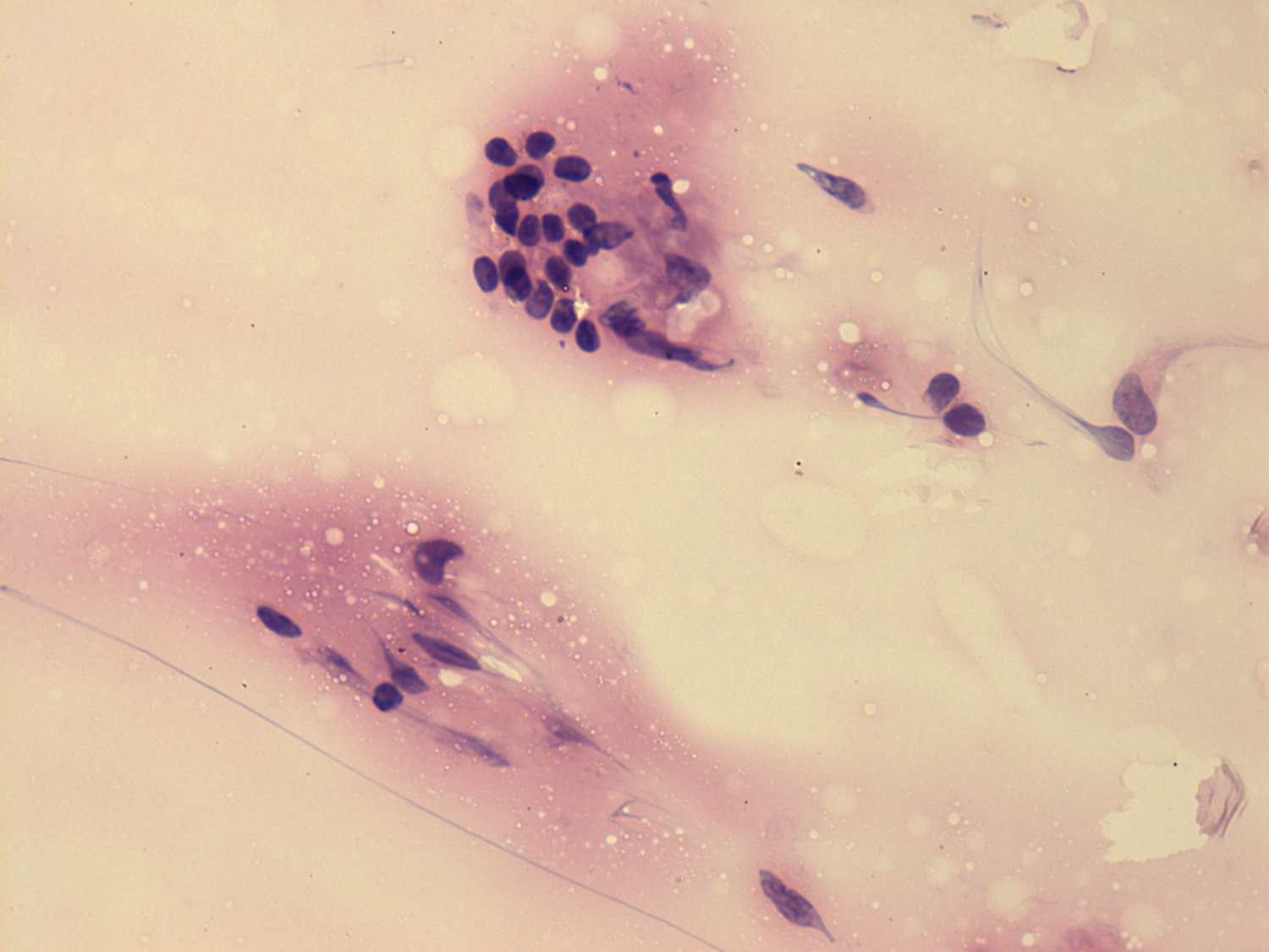 Pap-smear, 400x. The upper multinucleated cell contains thyrocytes while the lower one does epithelioid cells.