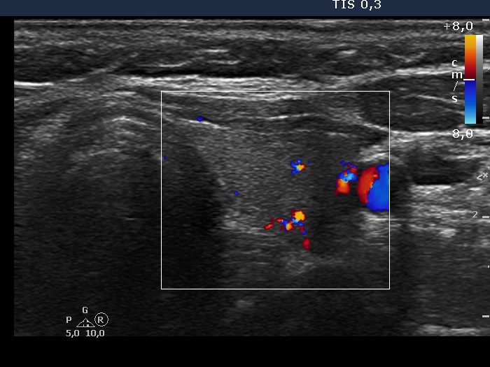 Left lobe, transverse scan, color Doppler method. The vascularization is average.