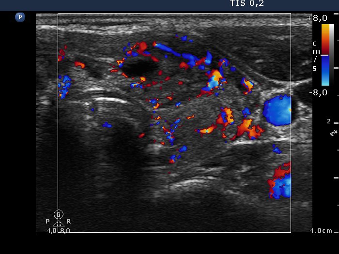 Lower part of the left lobe, longitudinal scan. The vascularity is increased.
