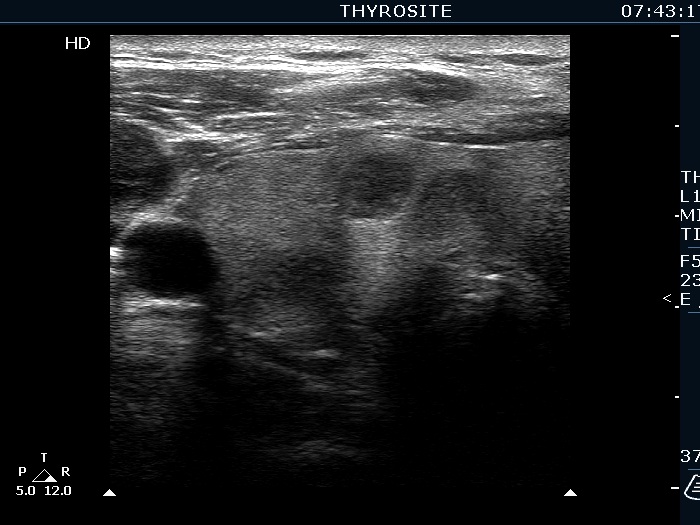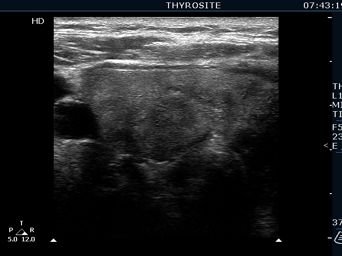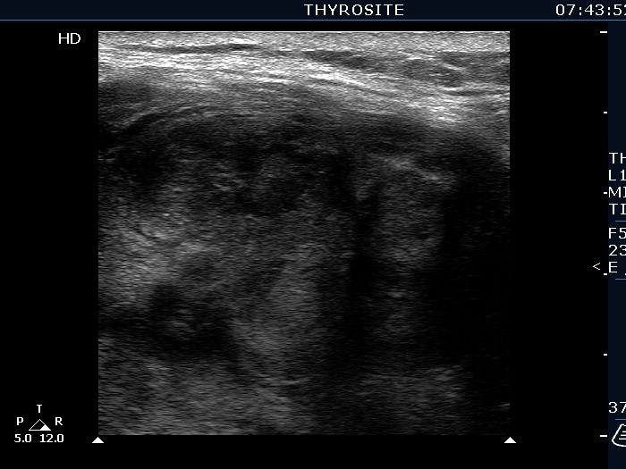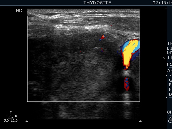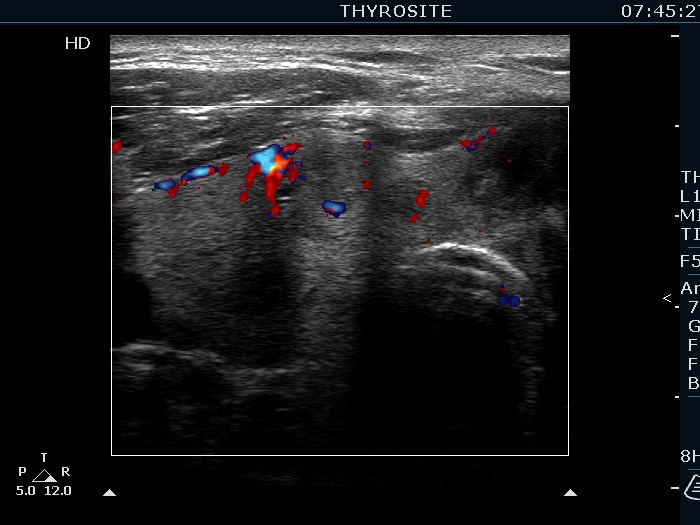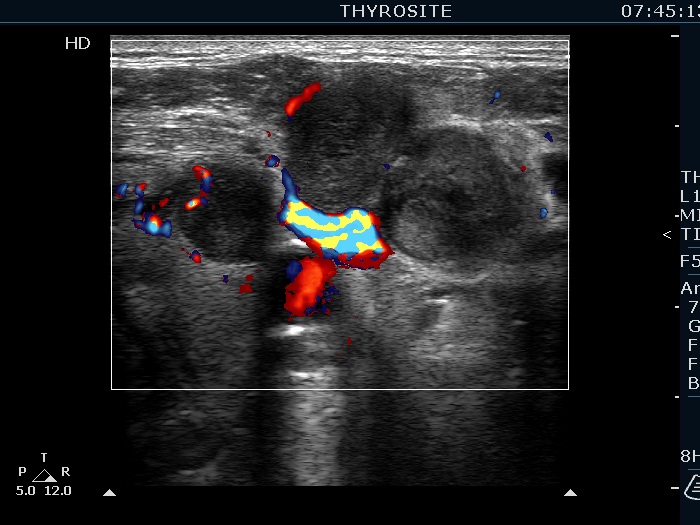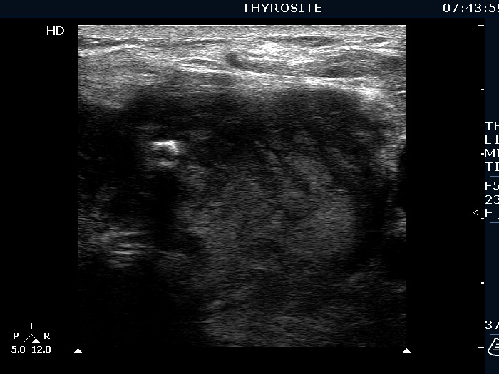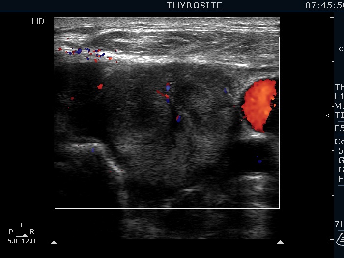 Ultrasonography. The right lobe was echonormal and presented several hypoechoic nodules. A large, inhomogeneous, partly deeply hypoechoic, partly minimally hypoechoic or echonormal mass occupied the left lobe. The borders of the tumor were irregular. There were multiple lymph nodules upper and lateral to the left thyroid lobe. The nodes had a heterogeneous pattern and lacked hilum. The vascularity was scanty both in the thyroid nodules and the lymph nodes.