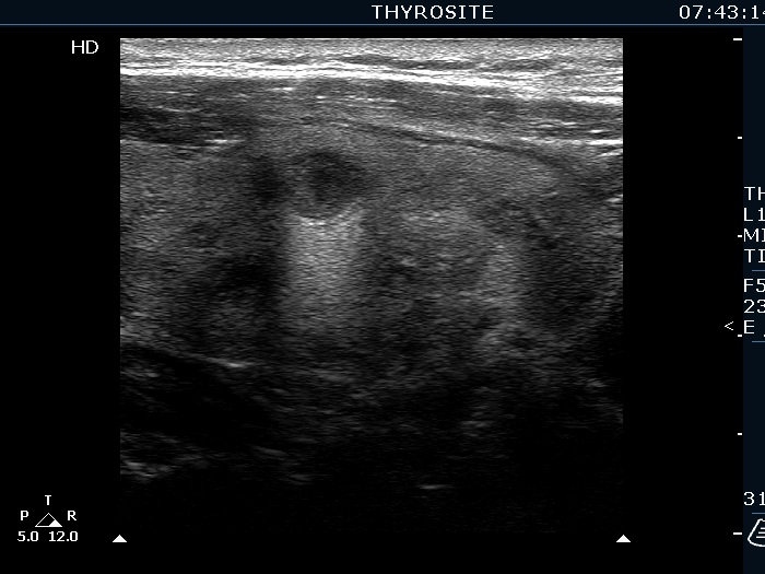We met the patient 8 years ago. The thyroid was echonormal. The right lobe had a solitary hypoechoic nodule with the dimensions of 12x10x13 mm, width, depth, length, respectively. FAN resulted in benign, colloid goiter.