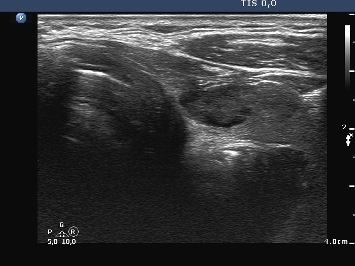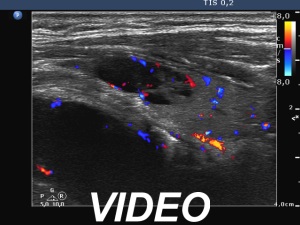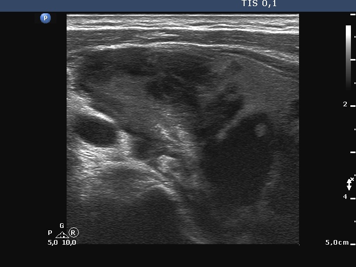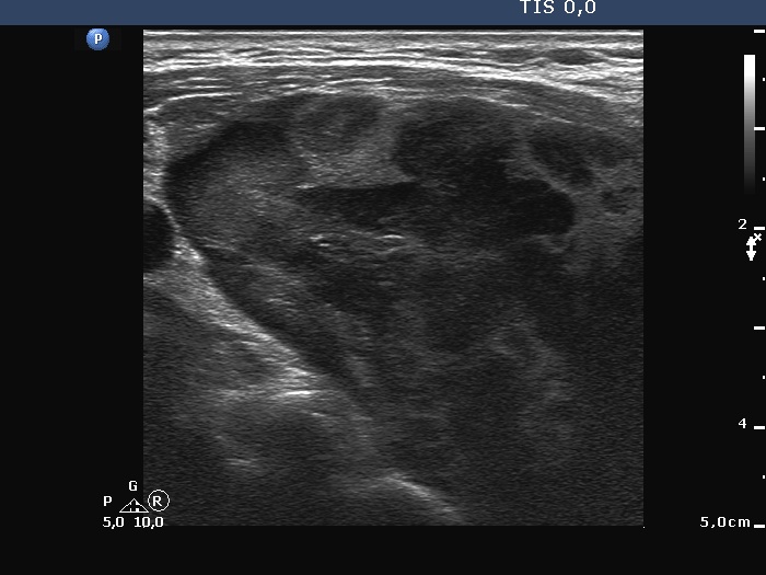 Clinical presentation: A 81-year-old man was referred for evaluation of a goiter. The patient noticed that a mass evolved within a few weeks in the right side of the neck 4 months ago. Then the mass has not further increased. The patient had minimal difficulties in swallowing.