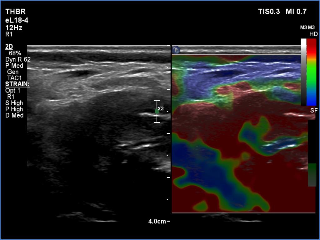 Right lobe, transverse view, elastography. The nodule has very hard areas.