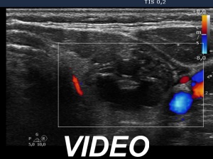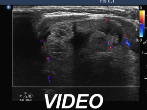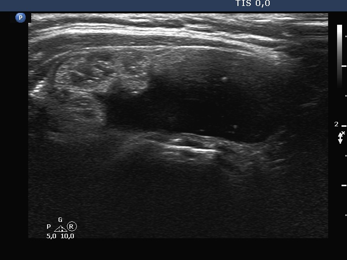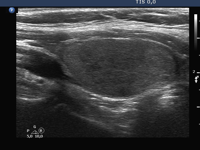 Ultrasonography. Both previously described nodules have significantly increased in size. The dimensions of the right nodule were 25x17x36 mm, width, depth, length, respectively.