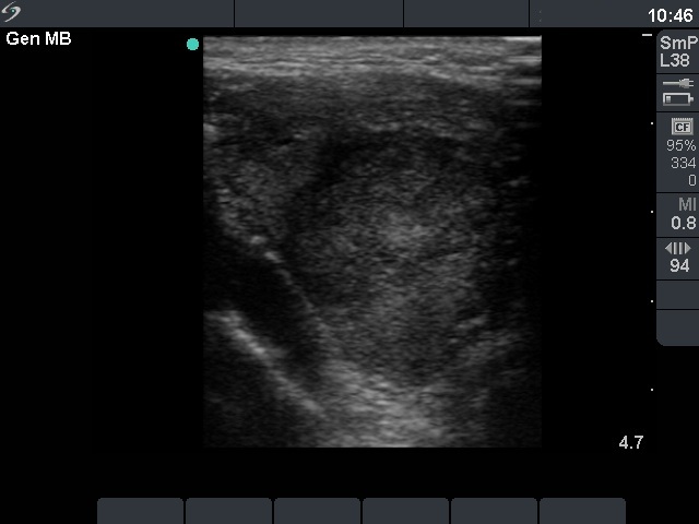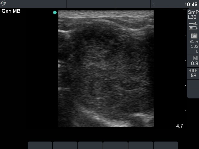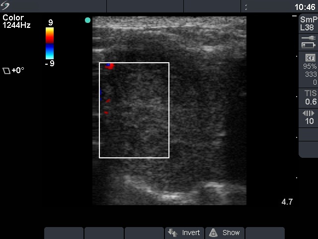 Ultrasonography. There was a large hypoechogenic nodule with irregular borders in the right thyroid. The vascularization was decreased.