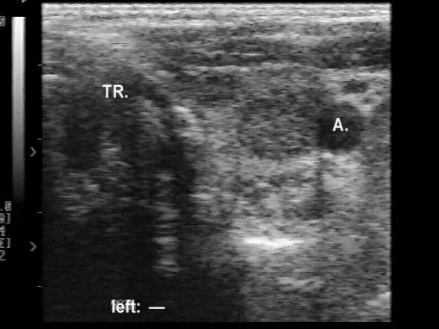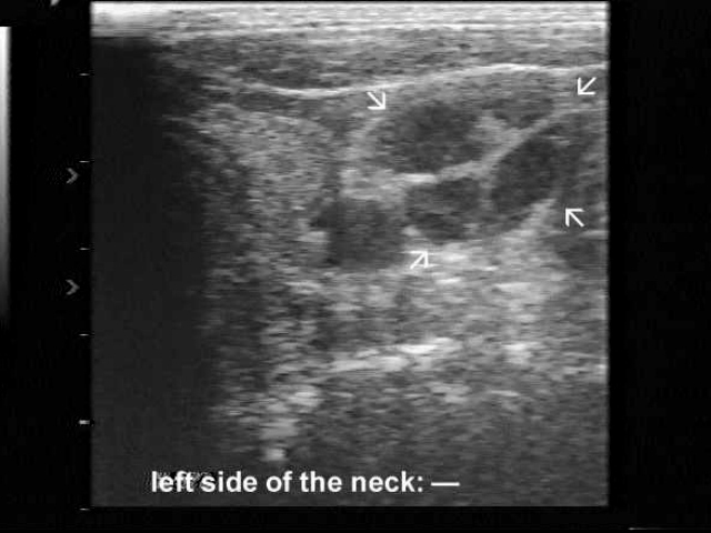 Ultrasonography. Besides the enlarged lymph nodes, US revealed a hypoechogenic lesion in the left lobe of the thyroid.