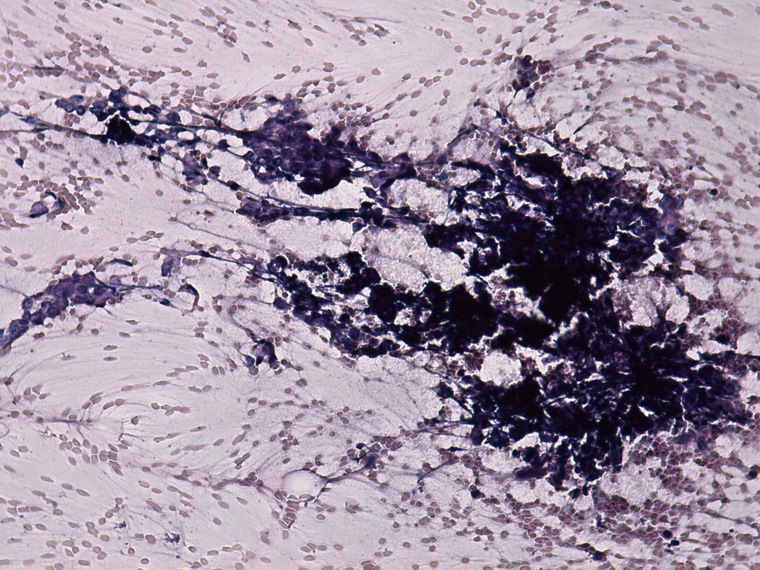 Pap-smear, 200x. The atypical cell clusters show nuclear crowding and overlapping.