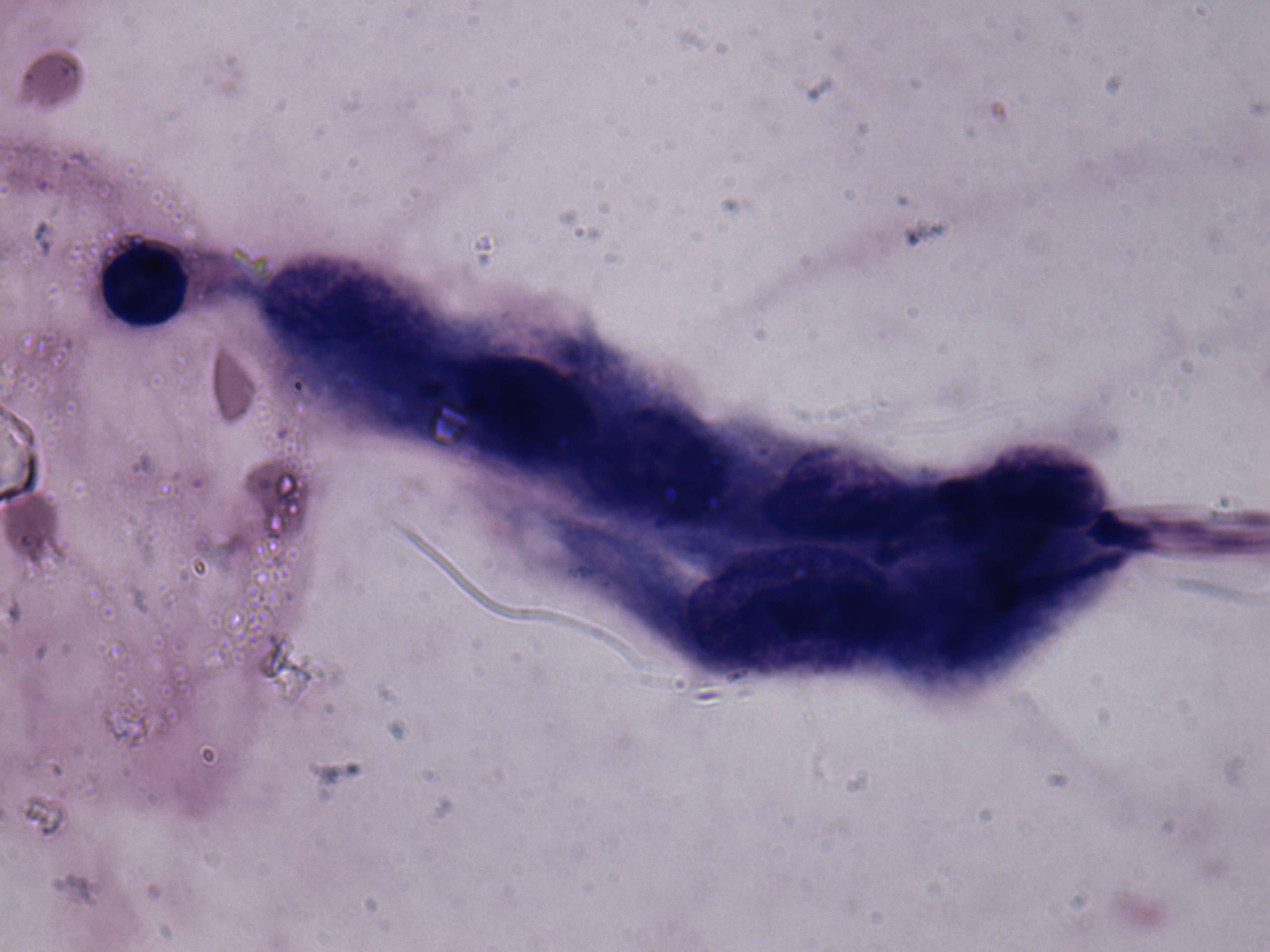 Pap-smear, 1000x. Elongated tumor cells and one hyperchromatic nucleus can be seen in this image.