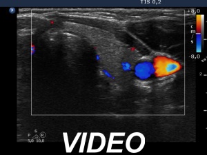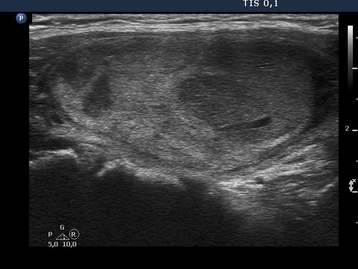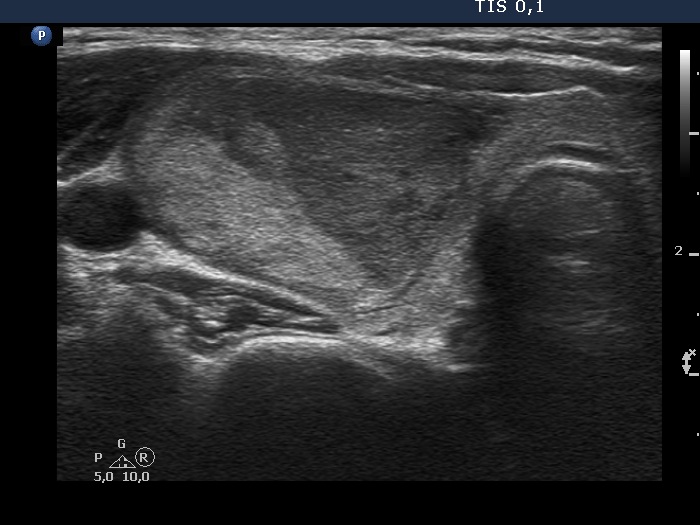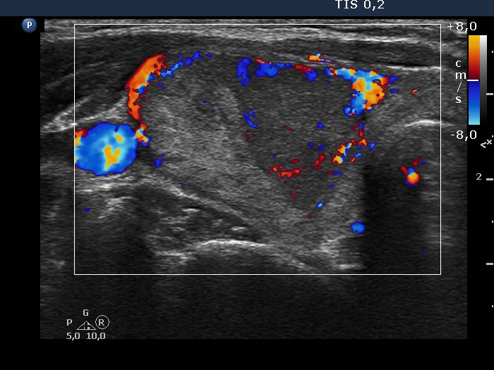 Ultrasonography. The thyroid was echonormal. There was a heterogeneous nodule in the right lobe. The lesion contained roughly equal proportions of echonormal and moderately hypoechoic portions. The nodule had a thin halo and presented perinodular blood flow.
