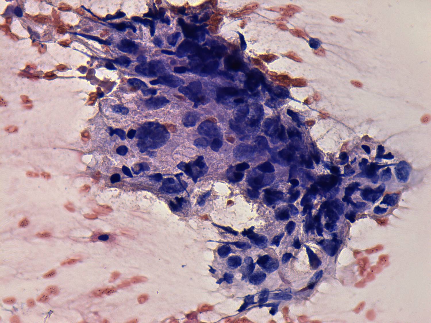 Pap-smear, 400x. Beside atypical, pleomorphic tumor cells, there are naked, small lymphocytes within the cluster.