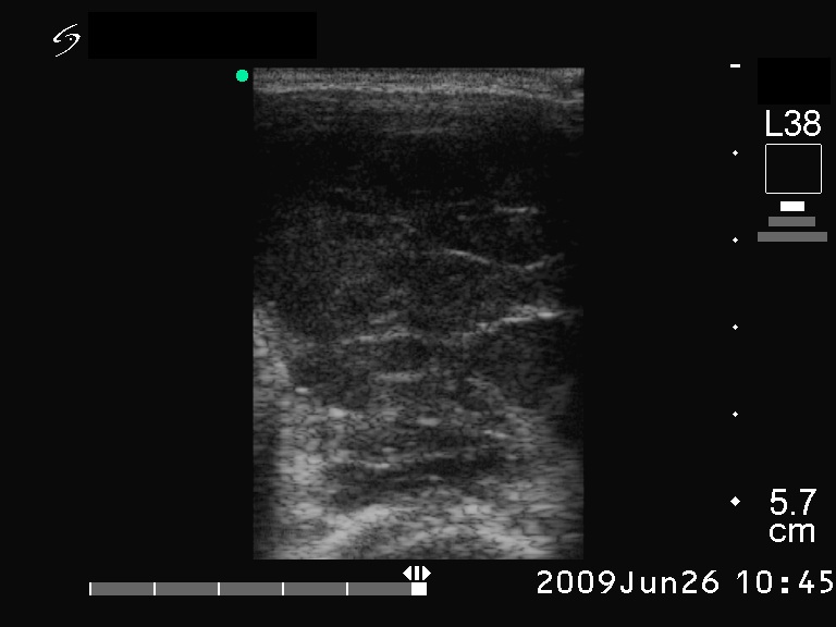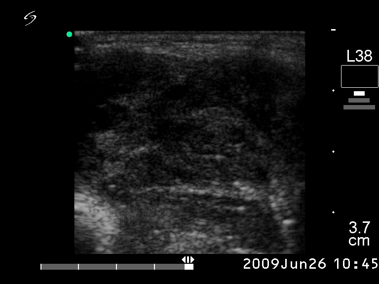 Ultrasonography. The right lobe was hypoechogenic and was not enlarged. The pattern in this lobe corresponded to Hashimoto's thyroiditis. There was a huge tumor in the left thyroid. The pattern of the left lobe varied from moderate to severe hypoechogenicity. The tumor was avascular.