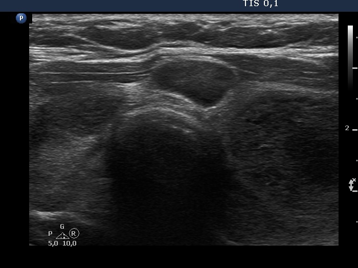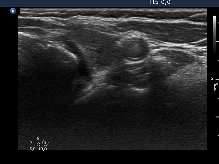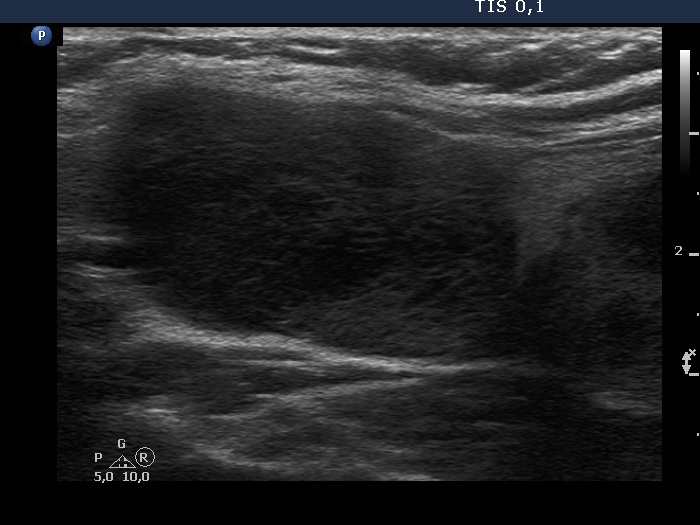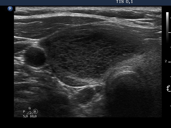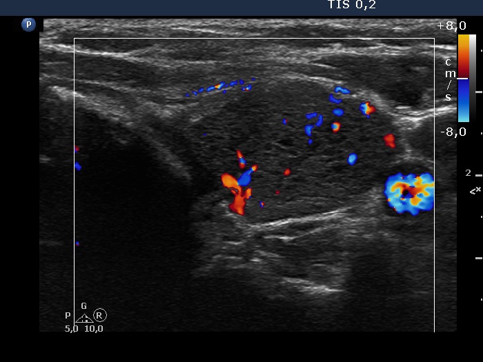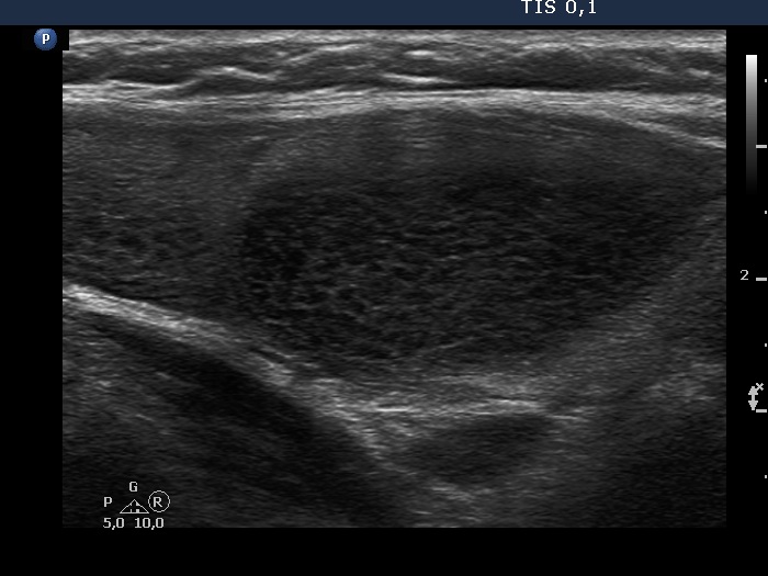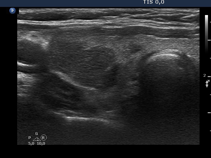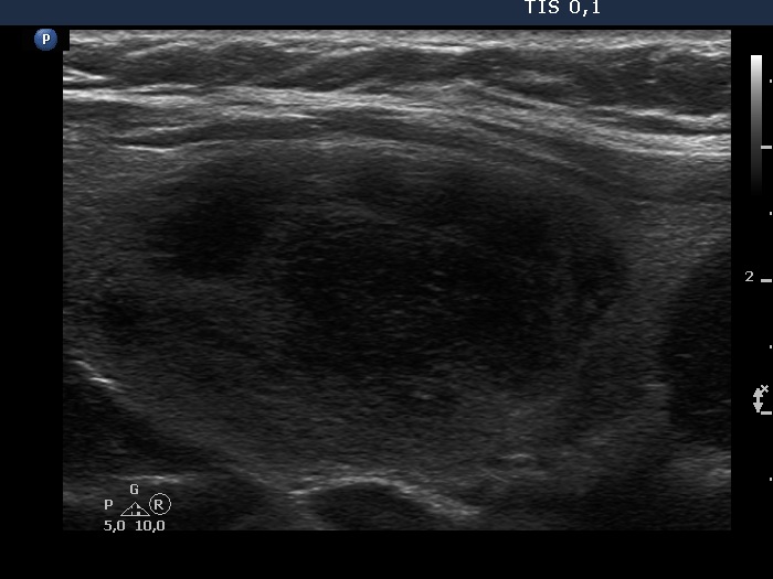 Clinical presentation: A 48-year-old woman requested a thyroid evaluation. She was diagnosed with a low grade, stage III/A non Hodgkin lymphoma two years ago. On the first and subsequent PET CT scan, no progression was detected, and on all occasions multiple foci were described within the thyroid. The patient hasn't got any therapy yet.