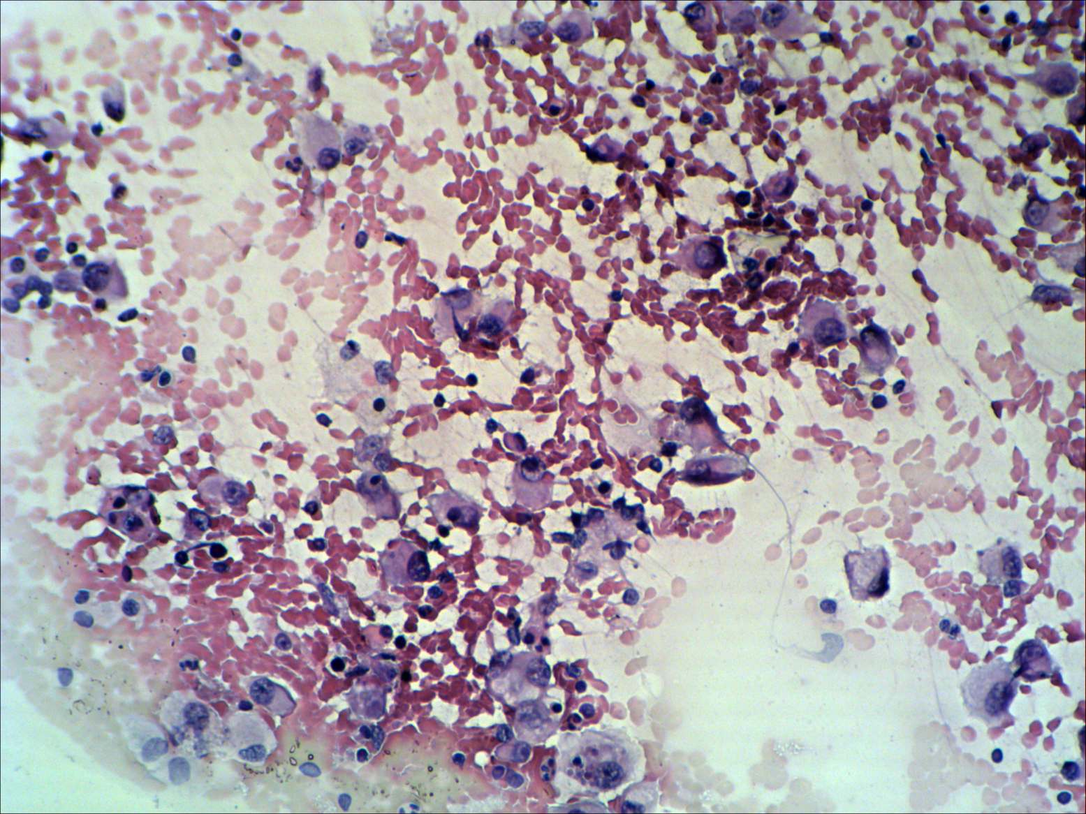 Pap-smear, 200x. Oxyphilic cells predominate the smear.