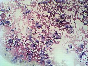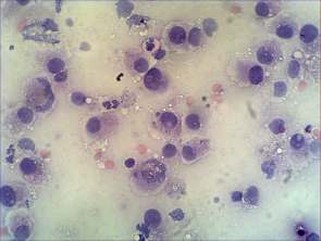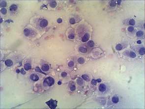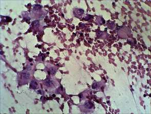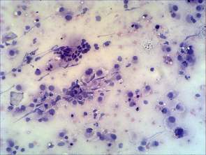 Comment. This is an unusual cytological pattern because of the relatively reassuring pattern and the lack of pleomorphic cells on the smears. The cytological pattern is in sharp contrast with the clinical picture.