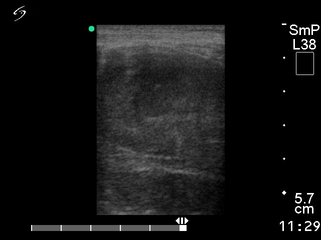 Ultrasonography. The basic echo structure of the thyroid was normal. There were multiple hypoechogenic nodules in the right lobe.