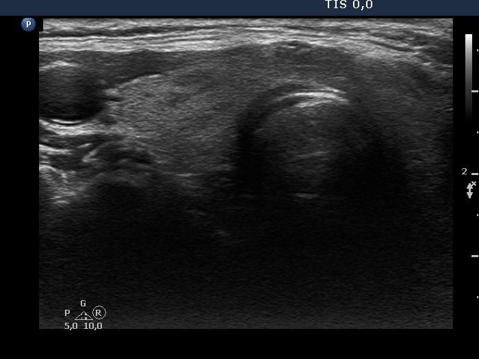Ultrasonography. The thyroid was echonormal and had tiny, moderately hypoechoic areas. The echogenicity index was around 10%. There was a dominantly hypoechoic, heterogeneous nodule in the left lobe. The lesion presented various echogenic figures, including microcalcifications and amorphous hyperechoic patches.