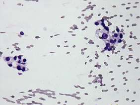 Cytology was performed form the nodule presenting microcalcifications and from that located in the lower pole of the left lobe. The latter resulted in benign colloid goiter while the cytology of the right nodule corresponded to a follicular tumor.