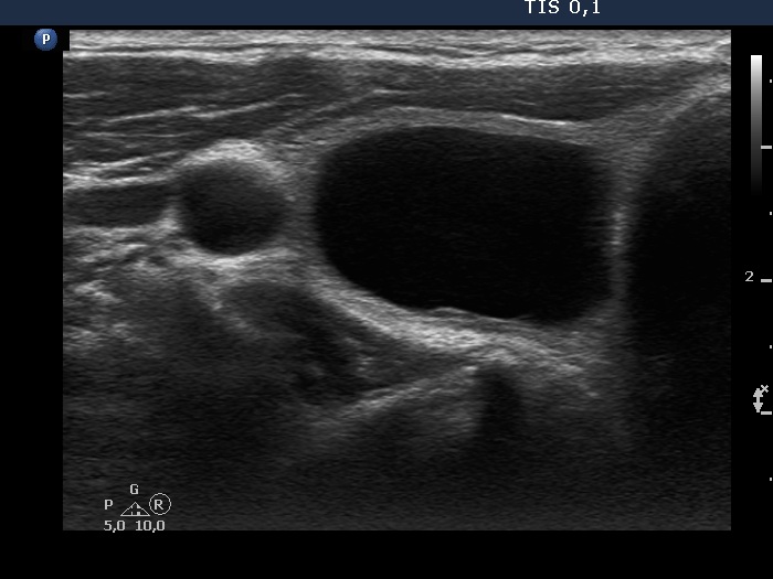 Ultrasonography. The thyroid was echonormal. A large nodule occupied almost the entire right lobe. This was an almost completely cyst with a tiny echonormal solid part at the ventral wall. The nodule had numerous large comet-tail artifacts and showed no vascularity. The dimensions of the nodule were 24x27x48 mm - 16.3 mL.