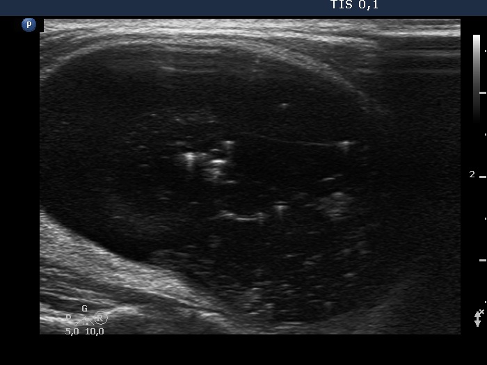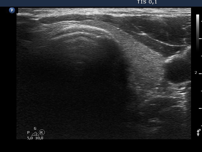Ultrasonography. Except for the size of the nodule, the pattern remained the same. The dimensions of the nodule were 23x15x33 mm - 5.95 mL.