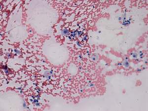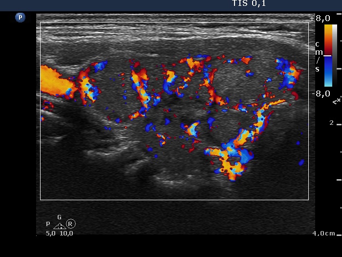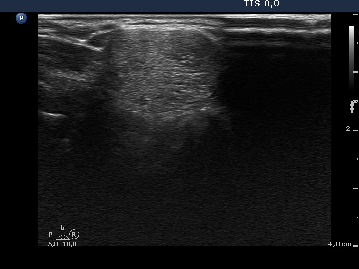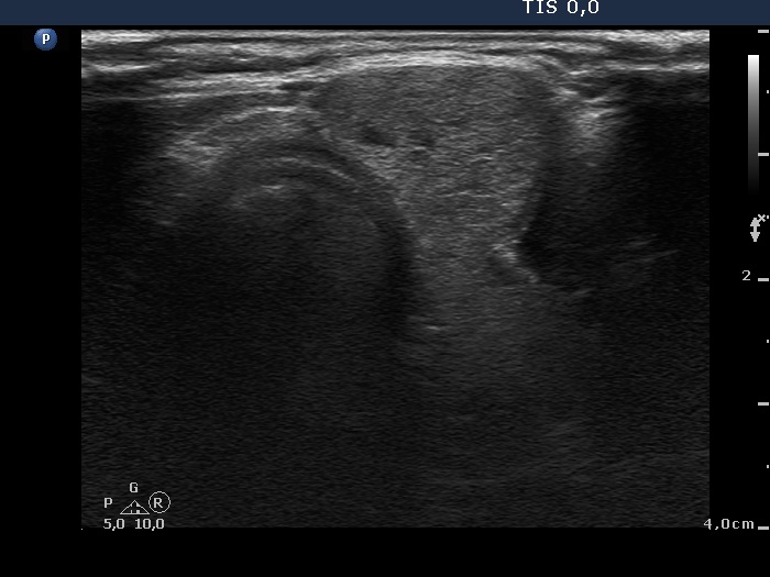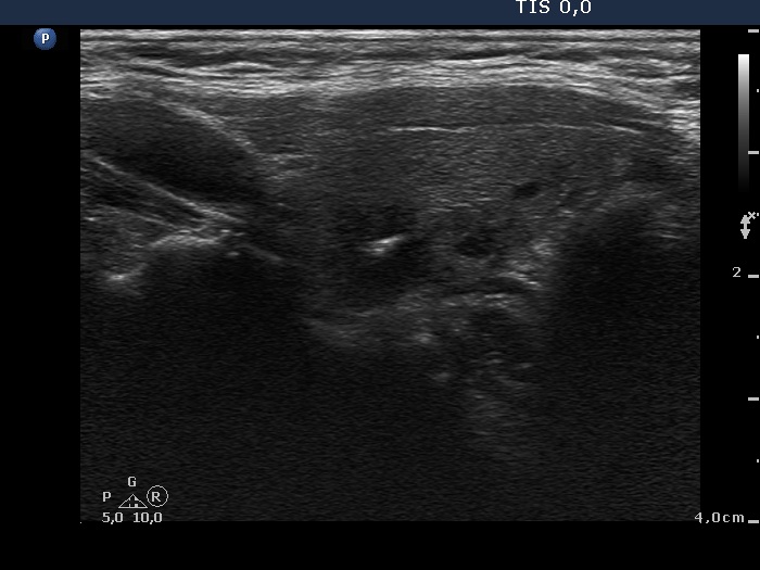 Cytology was performed from the hypoechogenic lesion in the left thyroid. The FNA was not diagnostic. Three weeks later we repeated the cytology which resulted in benign follicular proliferation.