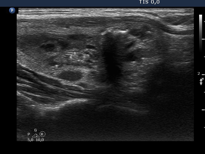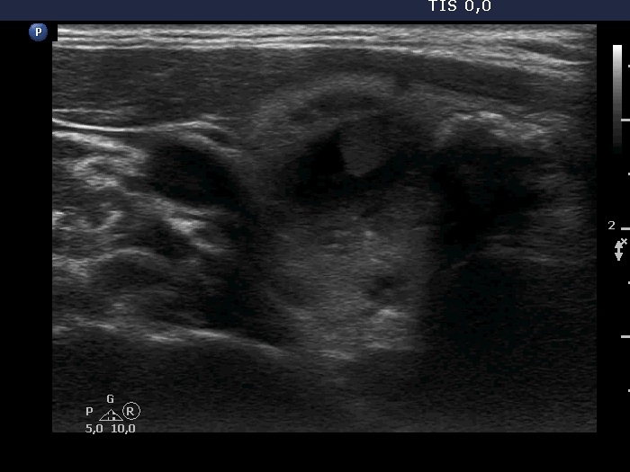 Clinical presentation: A 47-year-old woman came to a follow-up visit. We met her 12 years ago when 16 mL yellow fluid was aspirated form a nodule in the right lobe with the dimensions of 38x28x47 mm. There was a minimally hypoechoic lesion in the left lobe with the dimensions of 6x5x6 mm. Until recently, the cyst has not relapsed, but 2 weeks before the examination the patient noticed the appearance of the lump in the right lobe.