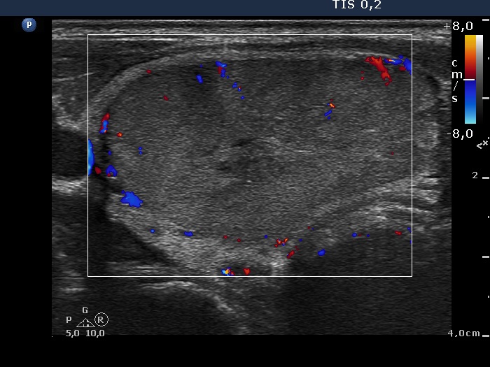 Ultrasonography. The thyroid was echonormal. There was a minimally-moderately hypoechogenic nodule in the right lobe. The presence of halo was doubtful, the lesion displayed perinodular blood flow.