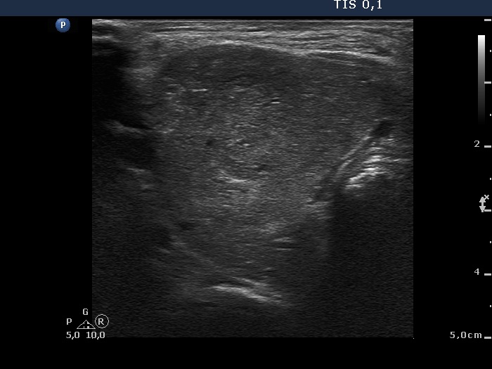 Ultrasonography. The thyroid was enlarged and contained numerous hyperechogenic nodules. There was a larger echonormal nodule in the ventrolateral part of the left lobe.
