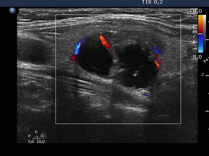 Left lobe, longitudinal view, color Doppler mode. The nodule has both perinodular and intranodular blood flows.