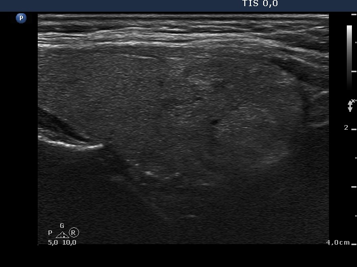 Ultrasonography. The thyroid was echonormal. Both lobes had multiple small discrete lesions, partly echonormal, partly moderately hypoechogenic. There were no nodules of oncological significance.