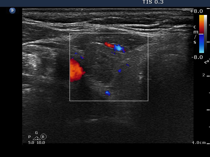 Right lobe, transverse scan, color Doppler mode. This lesion is avascular.