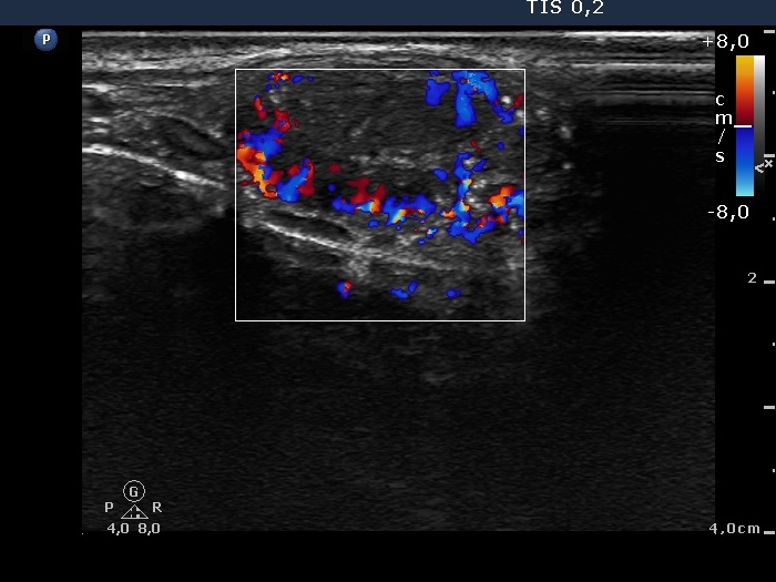 Left lobe, longitudinal scan, color Doppler mode. This image reveals a combined vascular pattern, the lesion has both perinodular and intranodular blood flow.