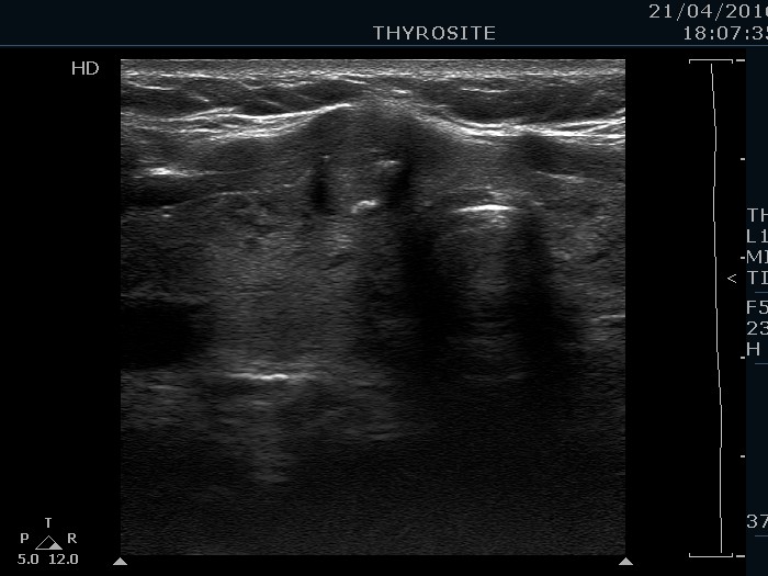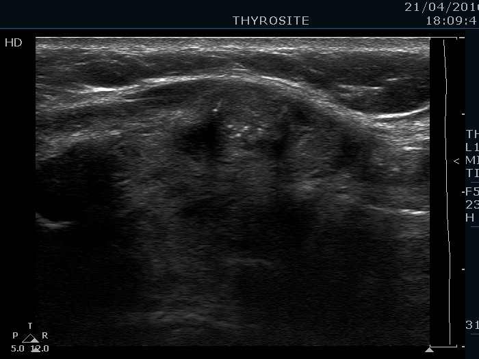Ultrasonography. The thyroid was echonormal and contained hypoechogenic areas. The echogenicity index was around 20%. There was a moderately hypoechogenic lesion presenting microcalcifications in the ventral part of the right lobe.