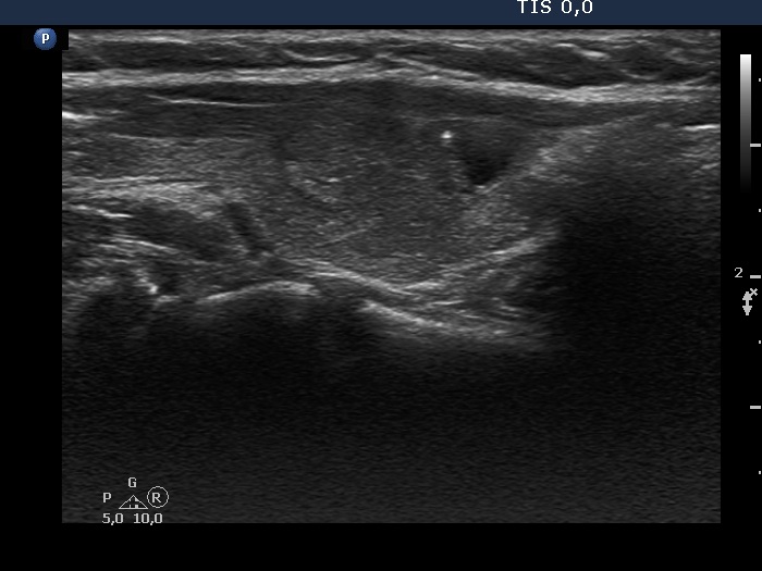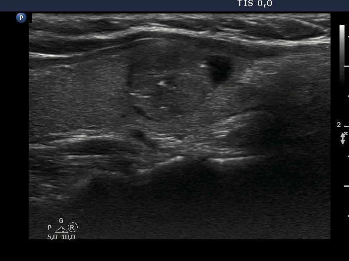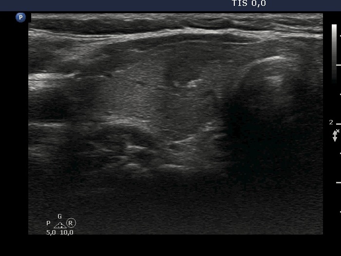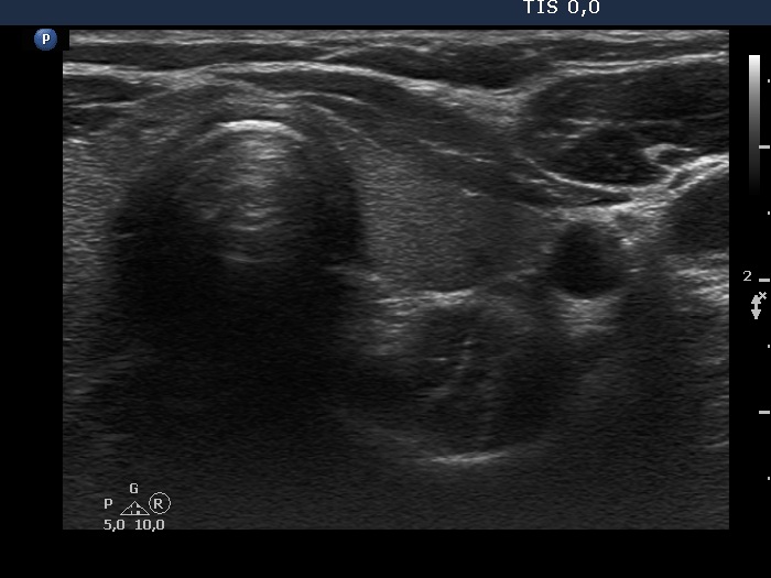 Ultrasonography. The thyroid was echonormal or minimally hypoechoic. There was a moderately hypoechoic nodule which had a cystic portion in the lower part. The nodule had lobulated margins and contained different hyperechoic figures. Beside figures caused either by posterior enhancement of proliferation of connective tissue, several ambiguous. bright granules were also found. Compared with the first measurement, the nodule is increased by more than 75% in volume.