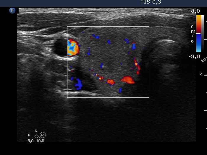 Clinical presentation: A 15-year-old girl came to a follow-up examination. We met her one year ago when her parents requested a second opinion. (On screening in the school, an enlarged thyroid was found. Thereafter, a benign nodule was diagnosed in another hospital.) We suggested ultrasound in a year.