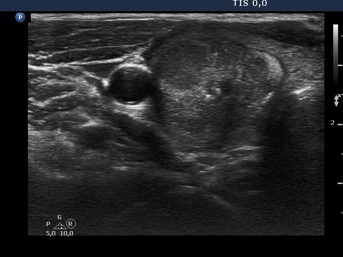 Ultrasonography. The thyroid was hypoechoic and presented with several discrete areas. A hypoechoic nodule occupied great part of the right lobe. The nodule had echonormal fields, microcalcifications and halo and presented perinodular blood flow.