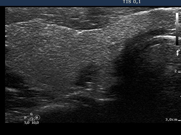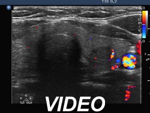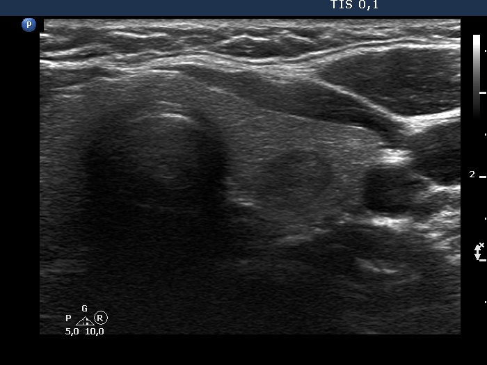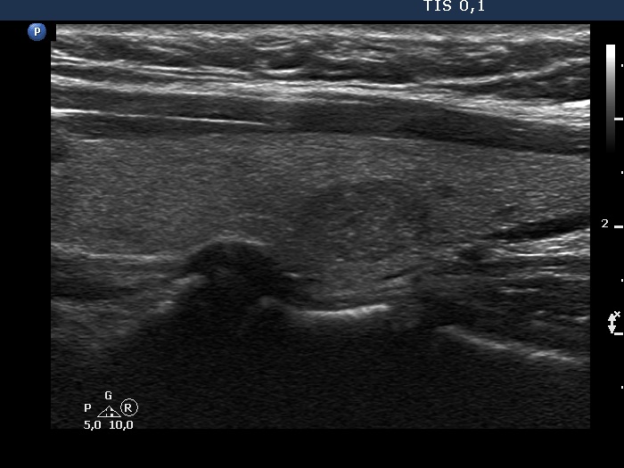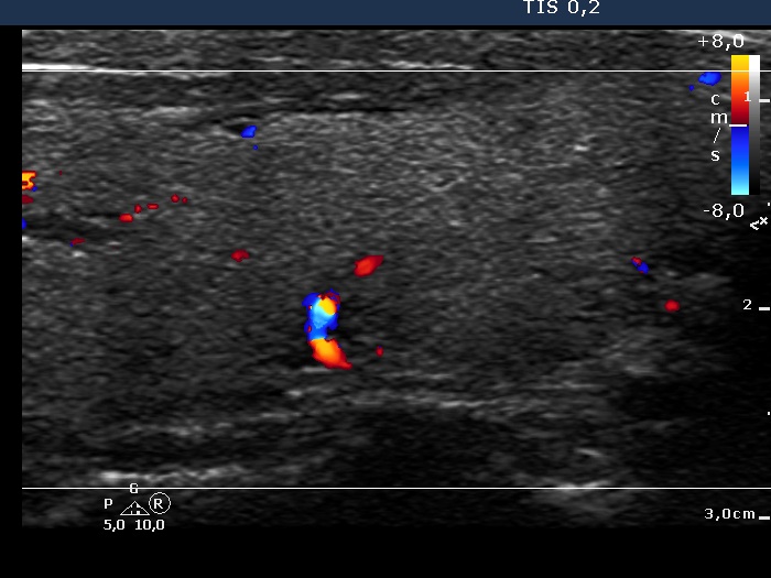 Ultrasonography. The thyroid was echonormal. There was a discrete, deeply hypoechoic area in the dorsal part of the right lobe. Although the dimensions were only 4x7x5 mm, width, depth, length, respectively, the lesion would correspond to a TIRADS 5 lesion because it was very hypoechoic and presented with irregular shape. However, color Doppler mode proved that this was indeed a vessel and not a solid thyroid tissue. The left lobe had a minimally hypoechoic lesion which largest diameter was 9 mm.