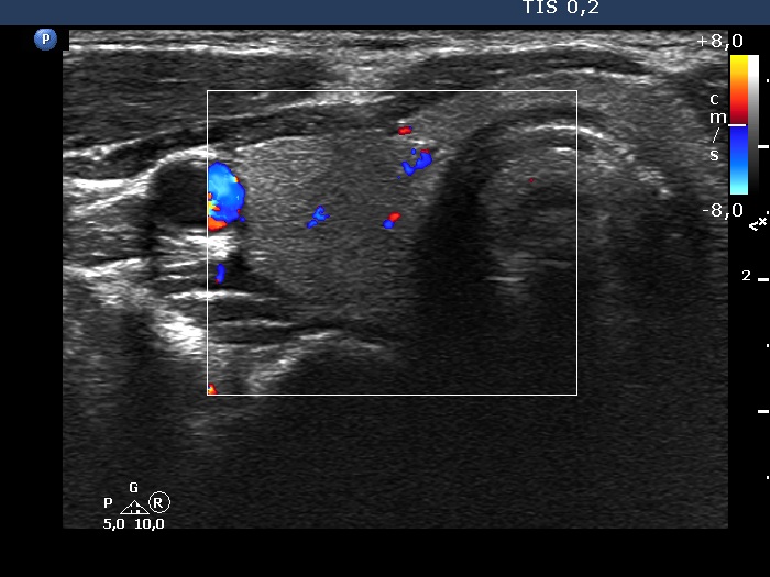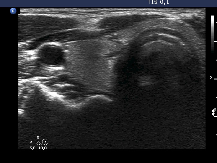 Ultrasonography. The thyroid was echonormal. On transverse scan, a minimally-moderately hypoechoic areas was found in the ventral part of the right lobe. Just ventral to this area, there was a thick connective tissue band within the strap muscle. This area could not be detected on longitudinal scan.