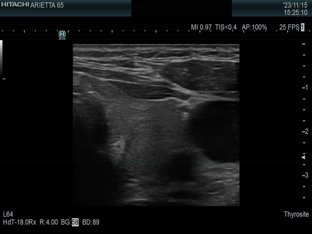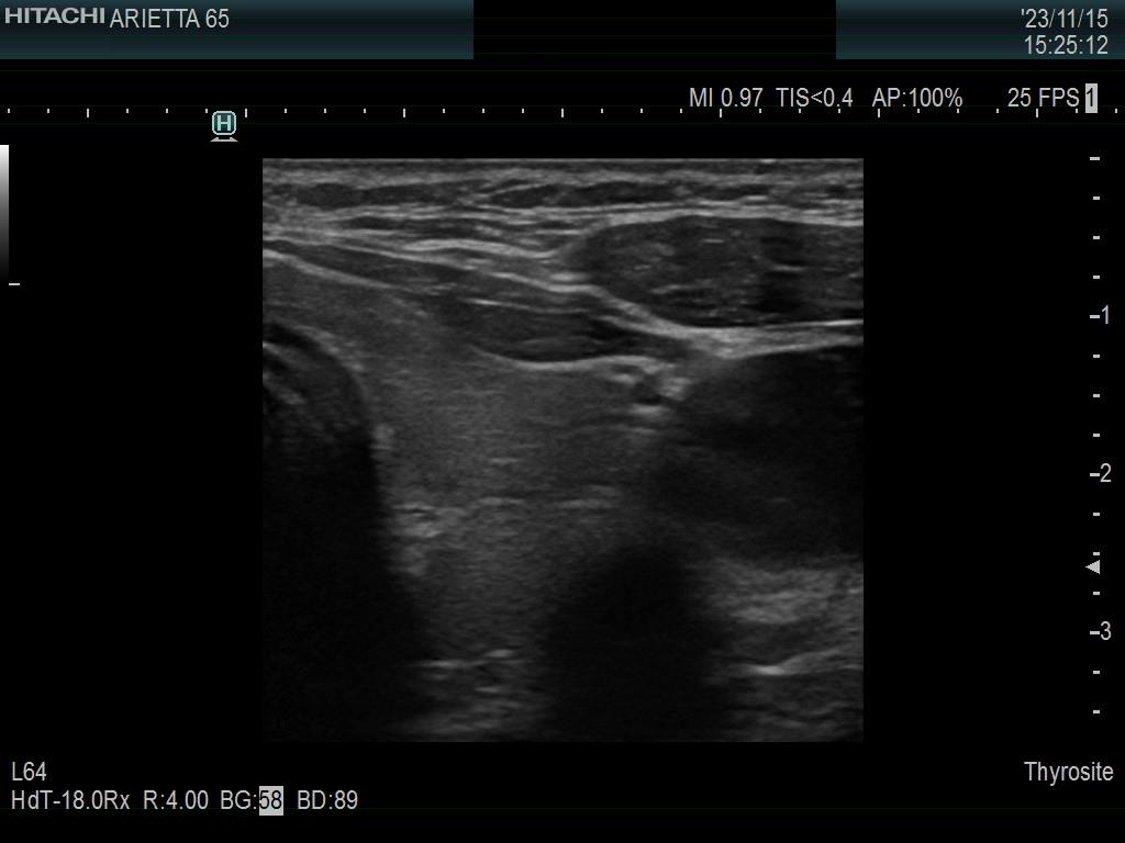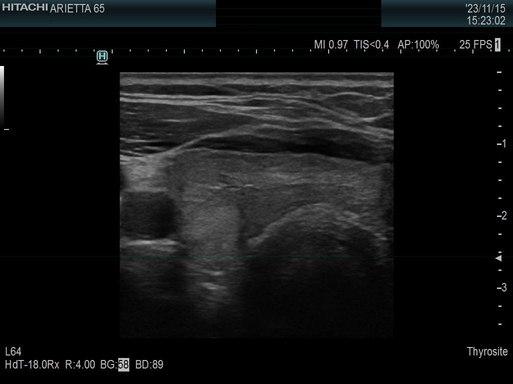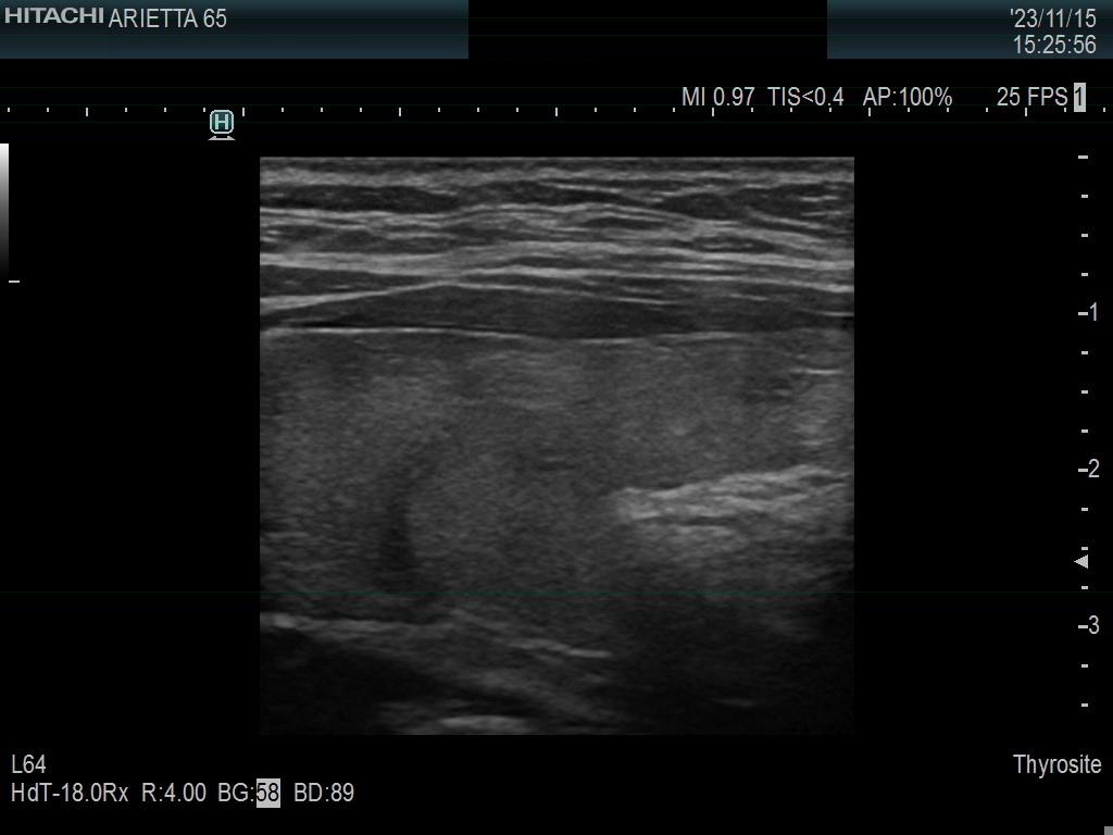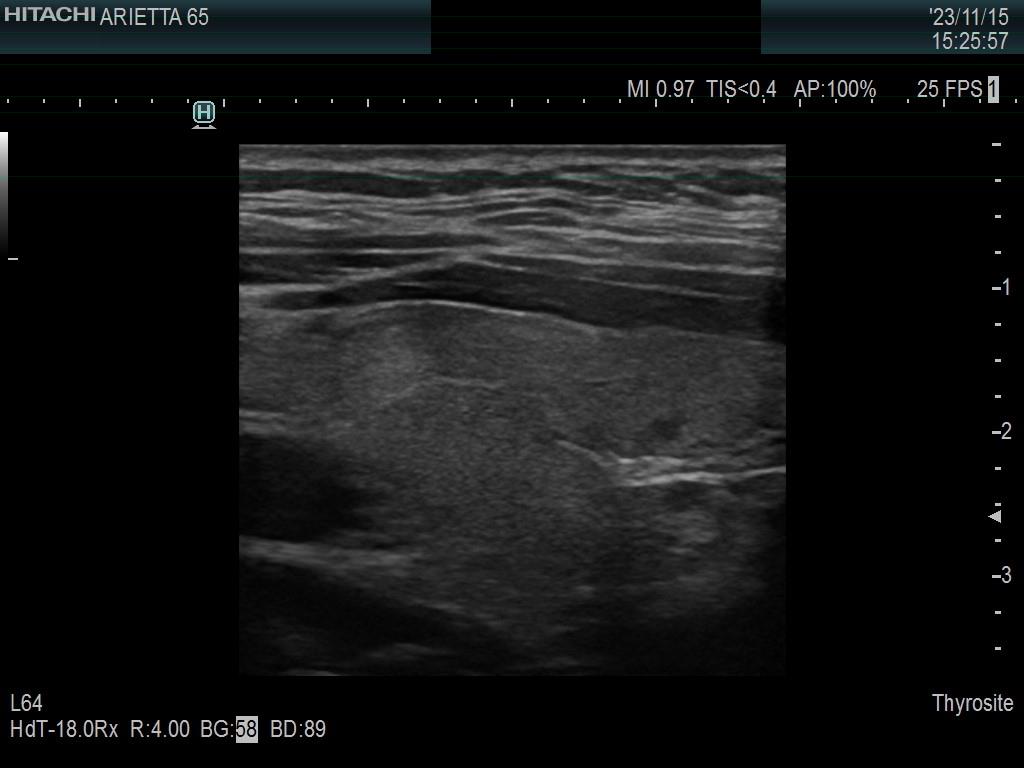 Ultrasonography. The thyroid was minimally hypoechoic. The echogenicity of the dorsal part of the left lobe where the nodule was previously described did not differ from other parts of the thyroid. There was a connective tissue running ventral to this part of the lobe and hypoechoic areas were found upper and dorsal to this. Neither halo nor perinodular blood flow was present.