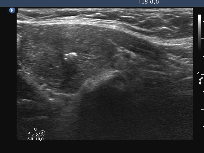 Ultrasonography. The right lobe was substantially enlarged and hypoechoic. It had macrocalcifications. The issue was whether the lobe was composed of a large nodule or only diffuse enlargement was present. The left lobe was much smaller. This lobe was also hypoechoic but to a lesser extent as was the right lobe. The vascularity was increased in the right while decreased in the left lobe.