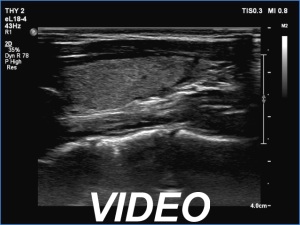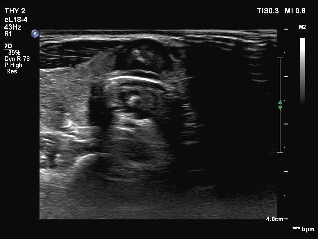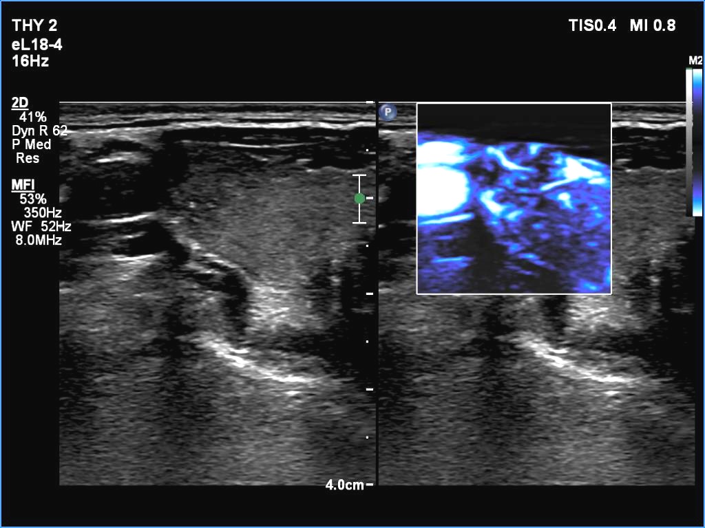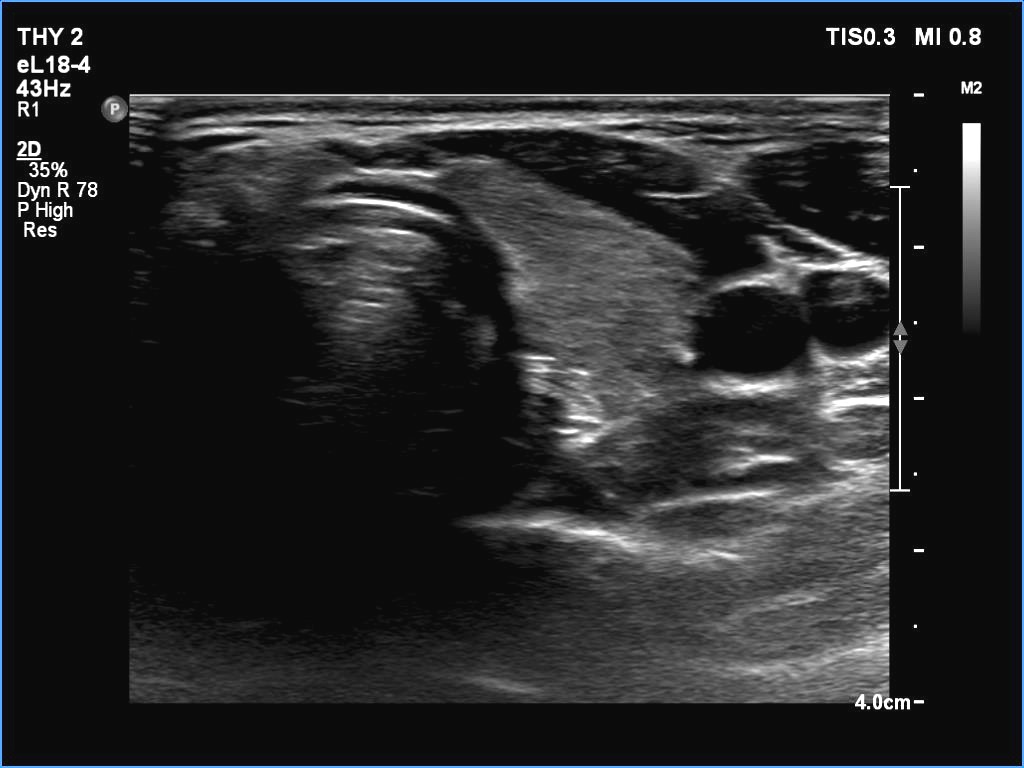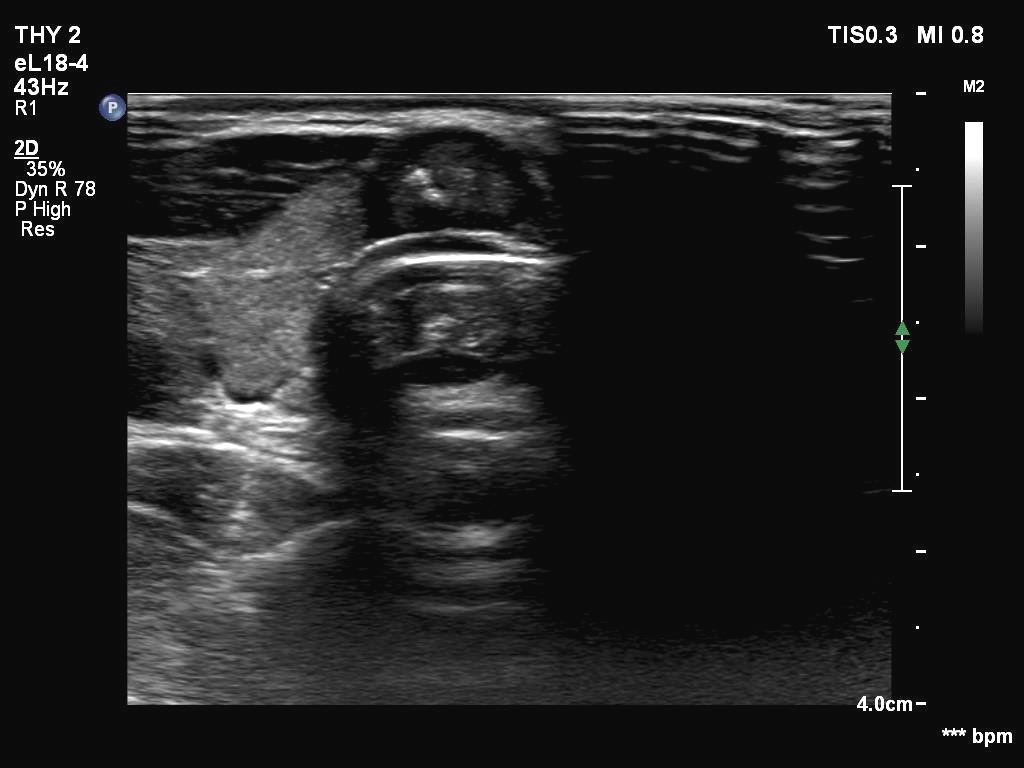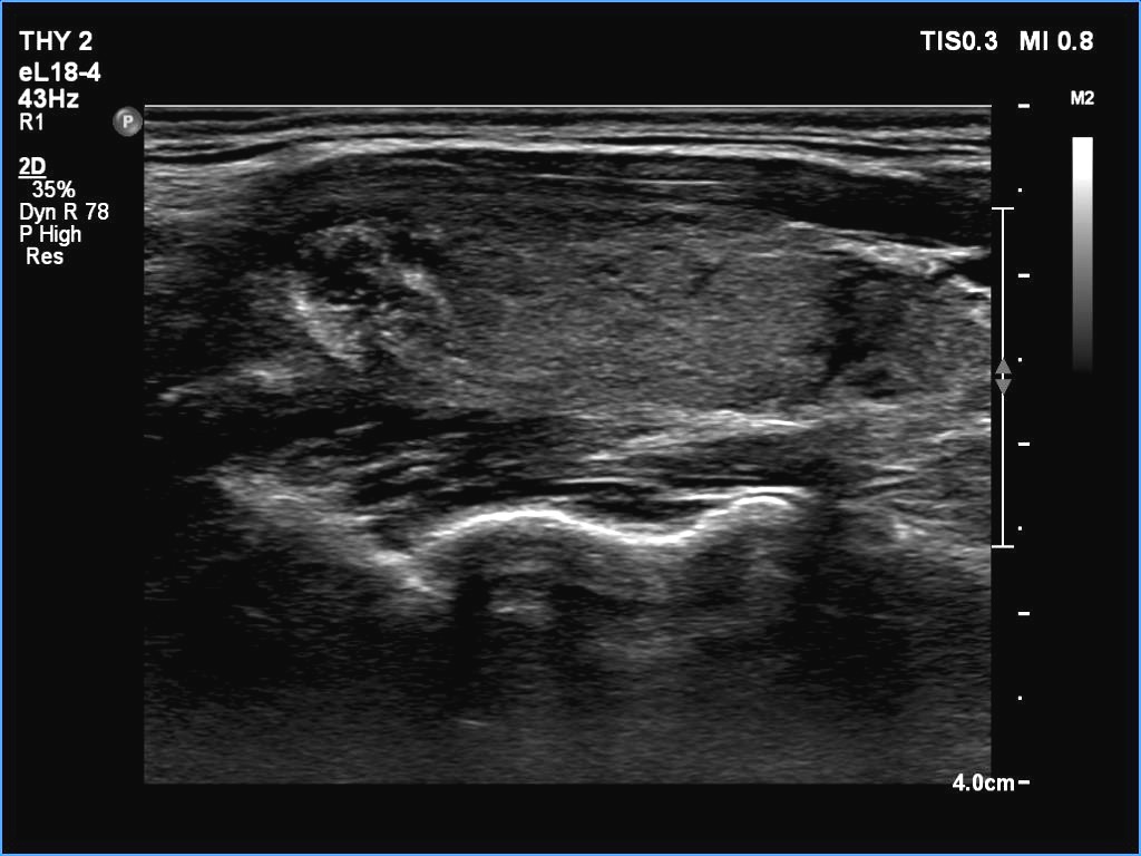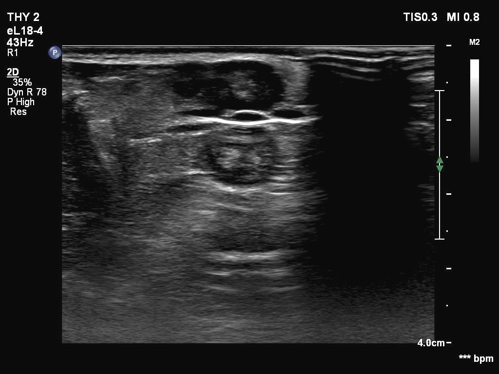 Ultrasonography. The thyroid was echonormal. There were two partly deeply hypoechoic nodules, one in the ventrolateral part of the right lobe and another one in the isthmus. Both had irregular margins and punctate echogenic foci. There was a mirror image artifact of the lesion in the isthmus.
