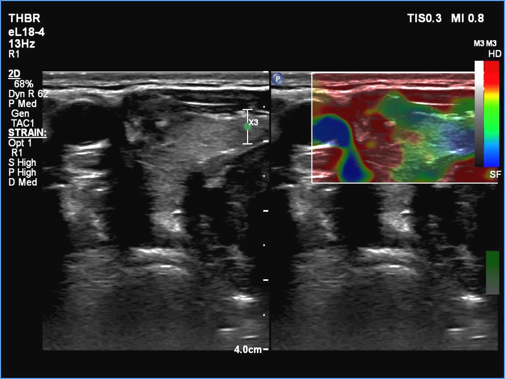 Palpation: a hard nodule in the isthmus and another firm lesion in the right lobe.