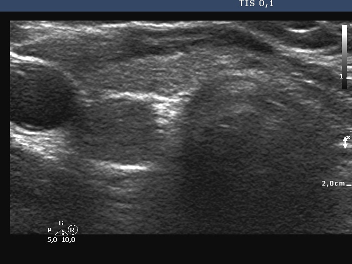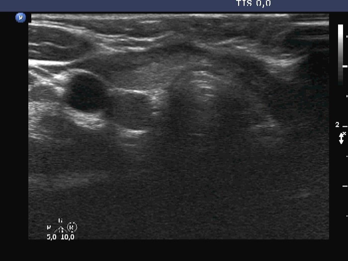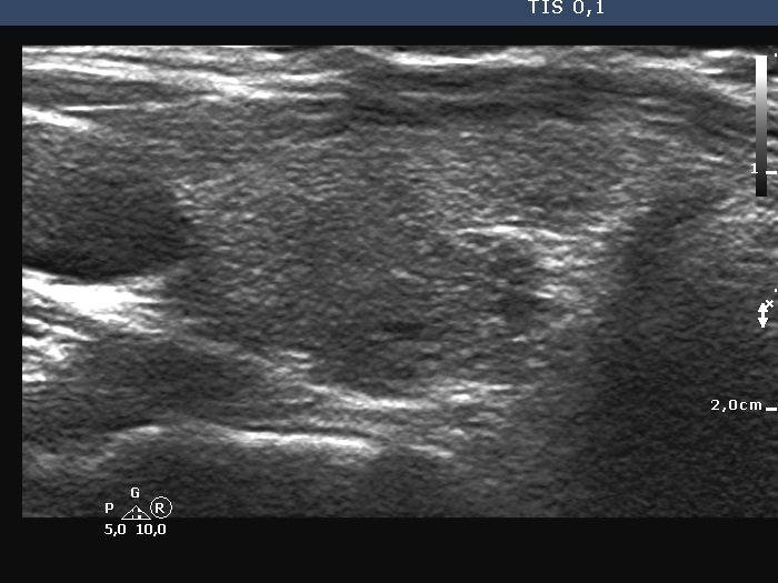 Clinical presentation: A 9-yr-old boy was referred for evaluation of a suspected nodule. He was examined because of diffuse complaints which raised the possibility of thyroid disfunction. On ultrasound, an ambiguous discrete lesion was described.